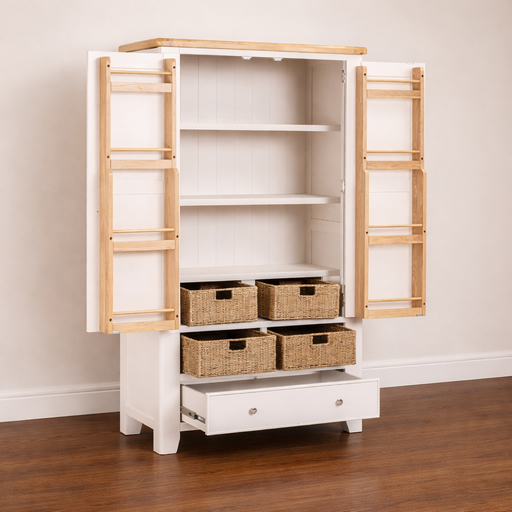 Maya Solid Wood Kitchen Larder Storage With Oak Top Bring both style and practicality into your home with the Maya Kitchen Larder, a beautifully cr...
