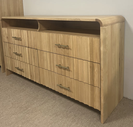 View full detailsRiveo Oak Veneered 6 Drawer Dressing Chest A modern oak-veneered dressing chest with a soft curved profile and distinctive textured drawer fronts f...